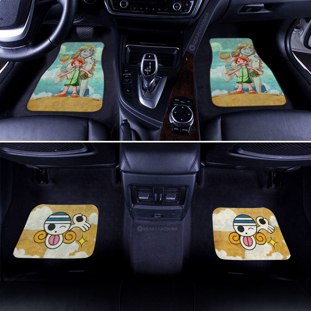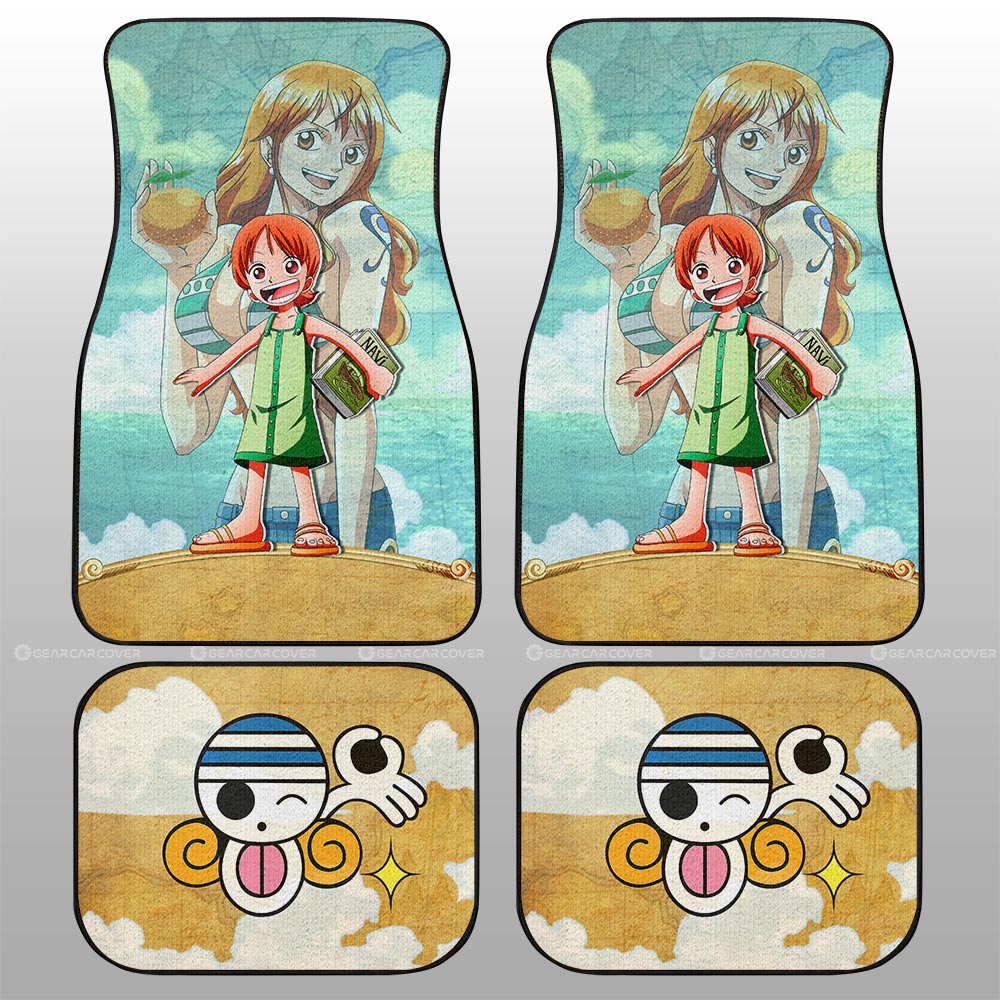 One Piece Car Mats Cute Young Nami Graphic Jolly Roger Symbol Car Floor Mats Yellow Blue