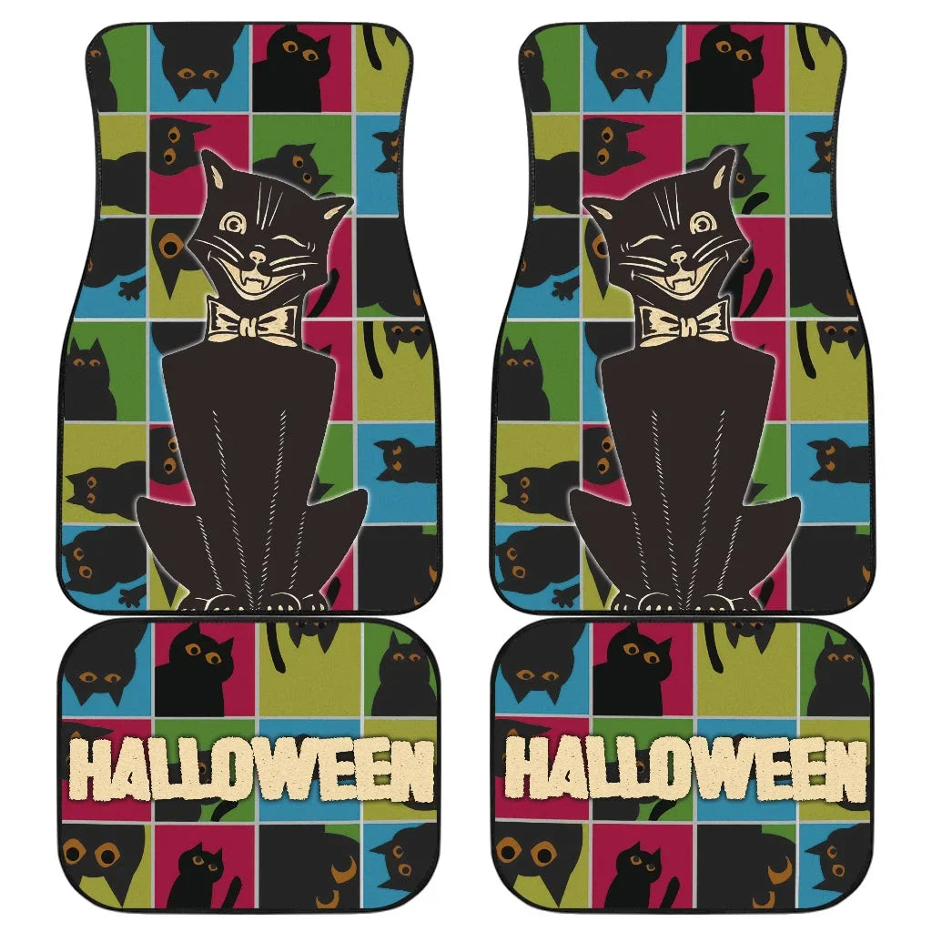 Halloween Car Mats Retro Black Cat Emotion In Square Patterns Car Floor Mats Colorful