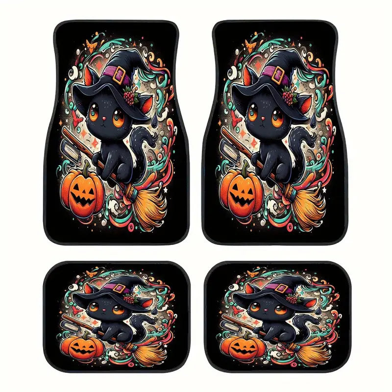 Halloween Car Mats Halloween Cute Witch Cat Flying On Broom Car Floor Mats Black Orange