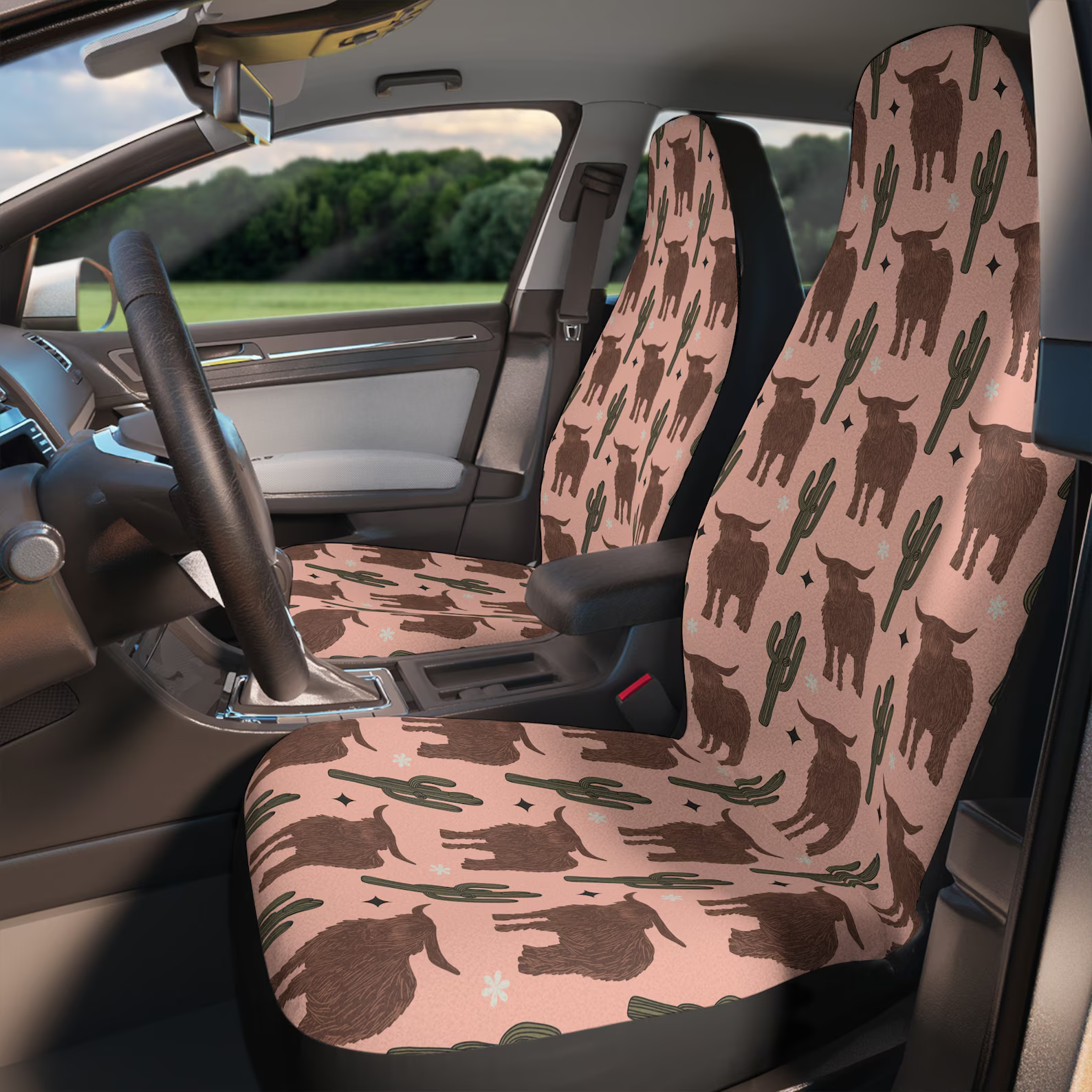 Cow Car Seat Covers Highland Cow And Cactus Pattern Seat Covers Brown