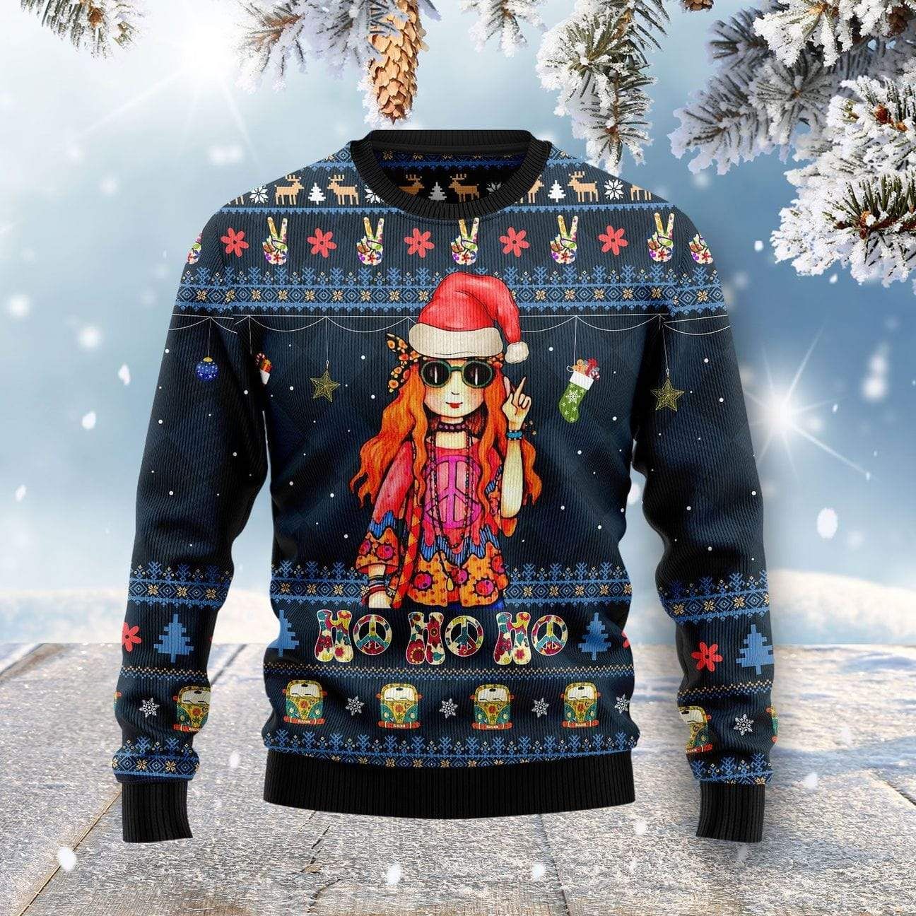 Hippie Sweatshirt Hippie Girl Ho Ho Ho Christmas Pattern Dark Blue Ugly Sweatshirt