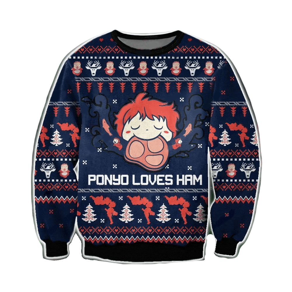 SGhibli Sweatshirt Ponyo Loves Ham Christmas Tree Pattern Sweatshirt Dark Blue Unisex