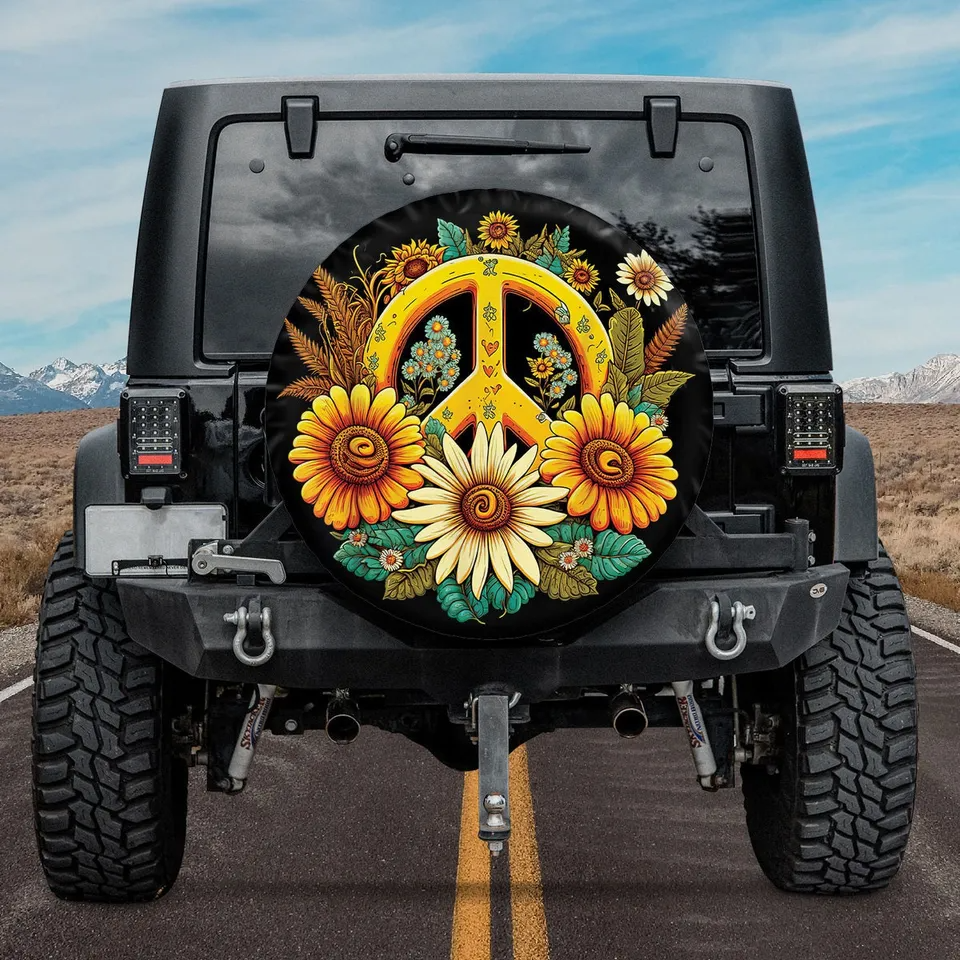 Hippie Spare Tire Cover Hippie Peace Sign Retro Flower Sunflower Tire Covers Black Yellow