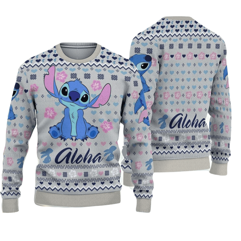 DN Stitch Sweatshirt Cute Stitch Aloha Heart Pattern Sweatshirt Gray Unisex