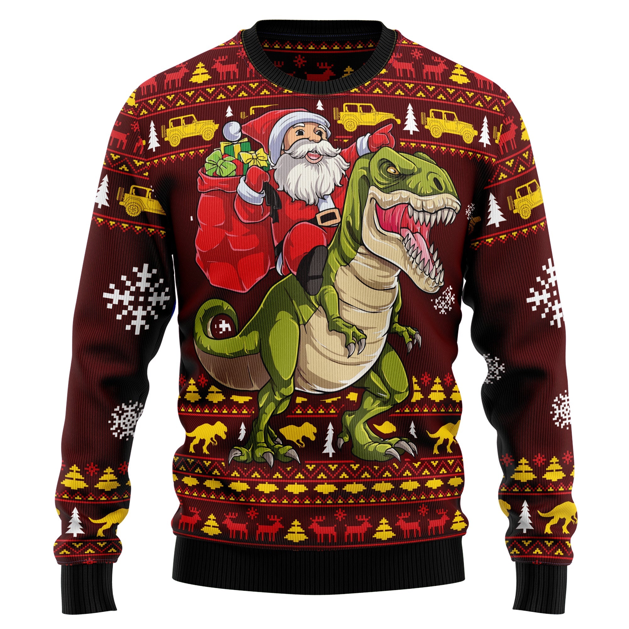 Dinosaur Sweatshirt Santa Riding T-rex Dinosaur Pattern Sweatshirt Dark Red Unisex